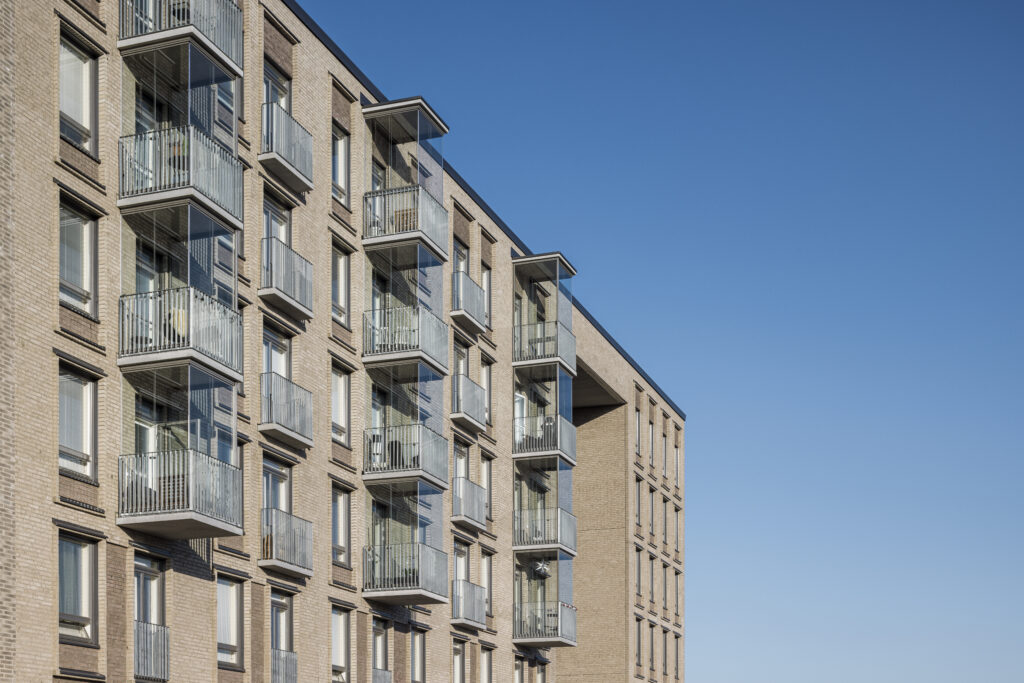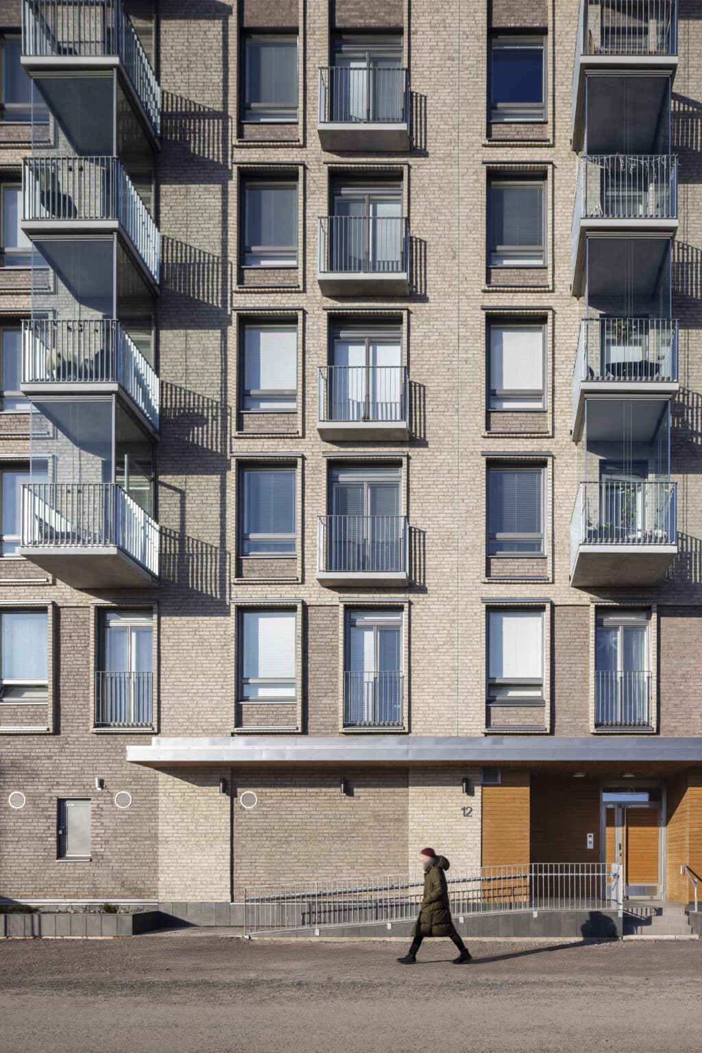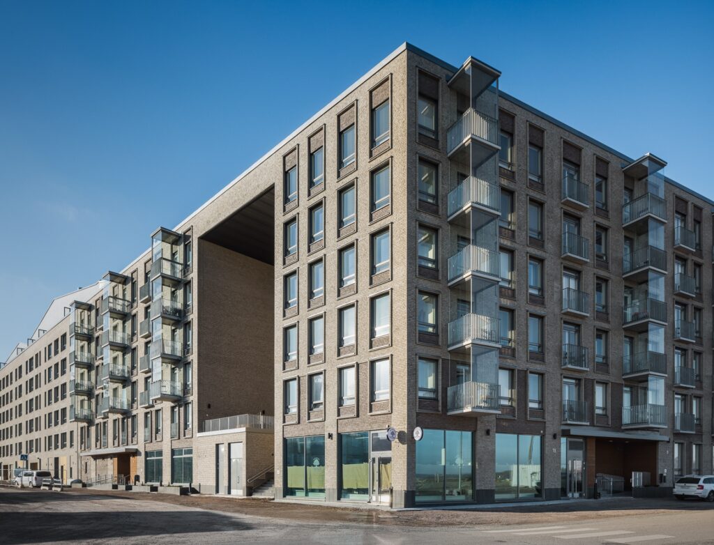Rakennukset ovat paikalla muurattuja ja sisäpihalta vaaleasti slammattuja. Ikkunajako on hillitty, rauhallinen ja aikaa kestävä. Ikkunoita ja tiilipintaa elävöittää ikkunaa kiertävä tiillikehys, sekä lämpimät harmaan sävyt. Pihakannelle johtavat suuret portaat ja aukon viereiset asunnot aukeavat ikkunoin myös kulkuaukkoon. Tähän aukkoon sijoittuu katettu oleskelutila, jossa kasvaa myös puu. Sisäpihan asunnoilla on omat terassipihat.