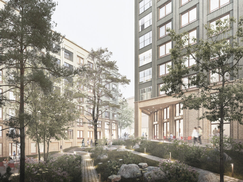 Rakennusten katot tukevat kestävää kehitystä: asuintornin katto toimii asuntopihana ja muiden rakennusten katot viherkattoina. Itäväylän puolella asumista suojaavat tapahtumakeskus ja pysäköintilaitos. Tapahtumakeskuksen porrastuva massa tuo valoa sisäpihalle, ja sen ravintolaterassi sekä aulatilat aktivoivat rakennusta Itäväylän ja metroaseman suuntaan.