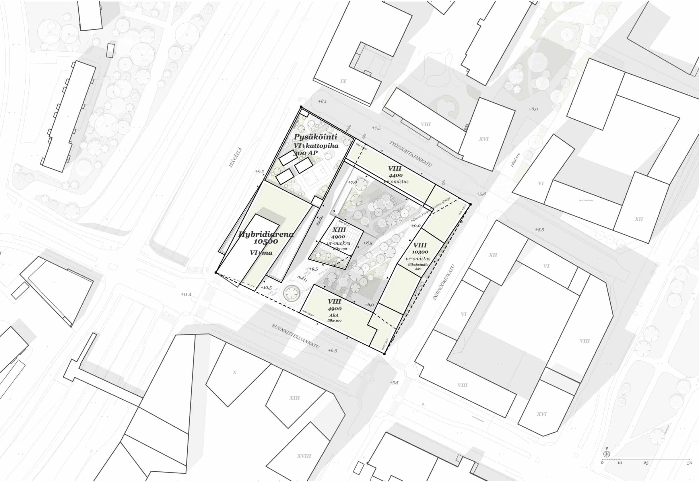 Korttelin massoittelu noudattaa asemakaavaa ja luo selkeän, kaupunkimaisen ilmeen. Yhtenäiset kahdeksankerroksiset asuinrakennukset muodostavat umpikorttelimaisen kokonaisuuden, jossa kulkuaukot ja porttikongit avaavat yhteyksiä kevyelle liikenteelle. Pääreitti kulkee diagonaalisesti Työnjohtajankadun ja Insinöörinkadun kulmasta kohti Hybridiarenan aukiota ja kauppakeskus Hertsiä. Korttelin sisälle sijoittuva 13-kerroksinen asuintorni toimii maamerkkinä ja luo valoisamman aukion tapahtumakeskuksen pääsisäänkäynnin yhteyteen.