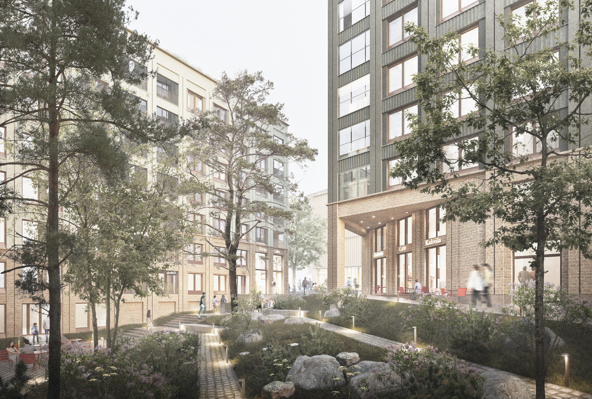 Rakennusten katot tukevat kestävää kehitystä: asuintornin katto toimii asuntopihana ja muiden rakennusten katot viherkattoina. Itäväylän puolella asumista suojaavat tapahtumakeskus ja pysäköintilaitos. Tapahtumakeskuksen porrastuva massa tuo valoa sisäpihalle, ja sen ravintolaterassi sekä aulatilat aktivoivat rakennusta Itäväylän ja metroaseman suuntaan.