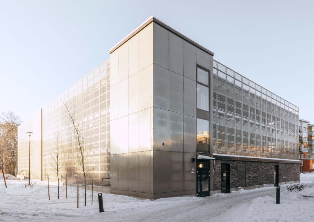 Läpituulettuvat julkisivut on verhoiltu pääosin perforoidulla, kuviopintaisella ja helmiäishohtoisella metallilevyllä. Korttelipihan puolella julkisivua verhoavat köynnöskasvit. Rakennuksessa on viistopintainen viherkatto.