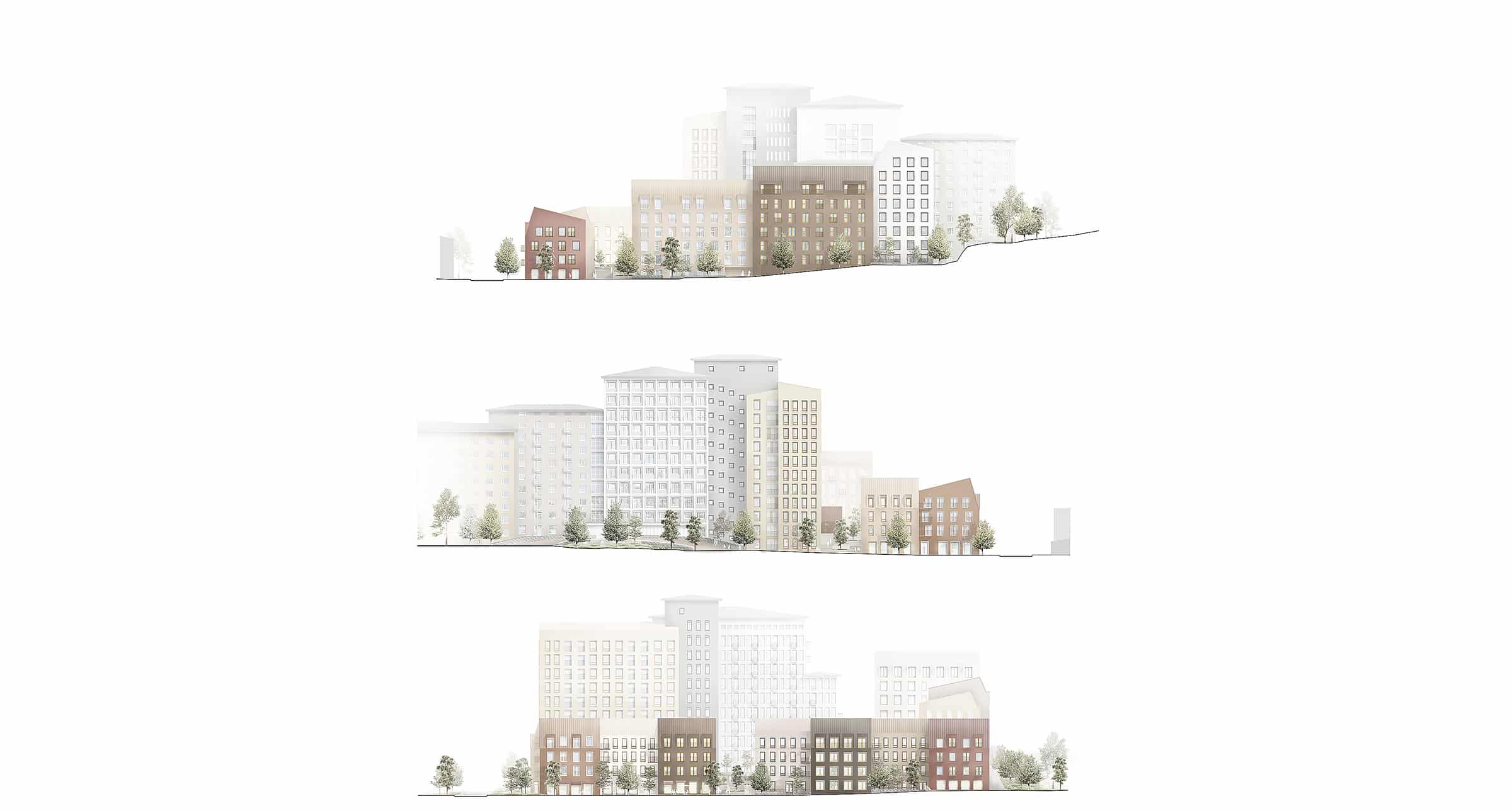 Isonniitynkadun uudisrakennusten mittakaava sekä räystäslinja mukailevat kadun koillissivun olemassa olevia rakennuksia. Uudisrakennusten ihmisläheistä mittakaavaa ja niiden muodostamaa elävää kaupunkikuvaa korostetaan lamellien polveilulla ja osajaottelulla. Kattomuotojen ja rakennusten asettelun myötä asuinlamellien katoille on myös mahdollista sijoittaa aurinkokeräimiä – ilman että ne näkyisivät liian häiritsevästi piha- tai katutiloihin.