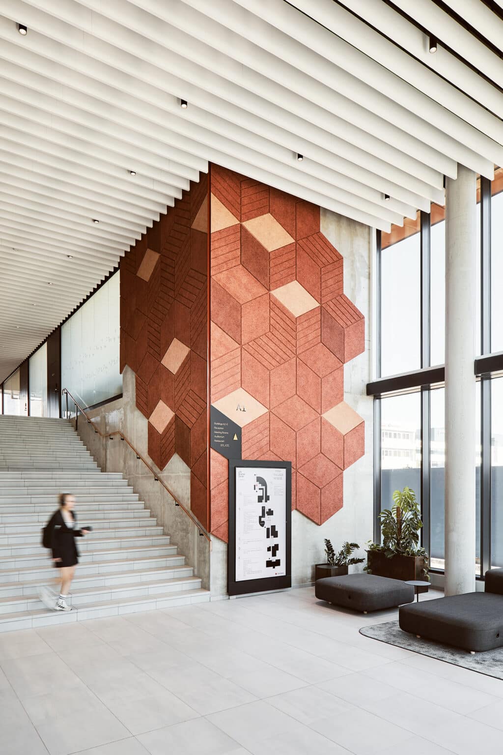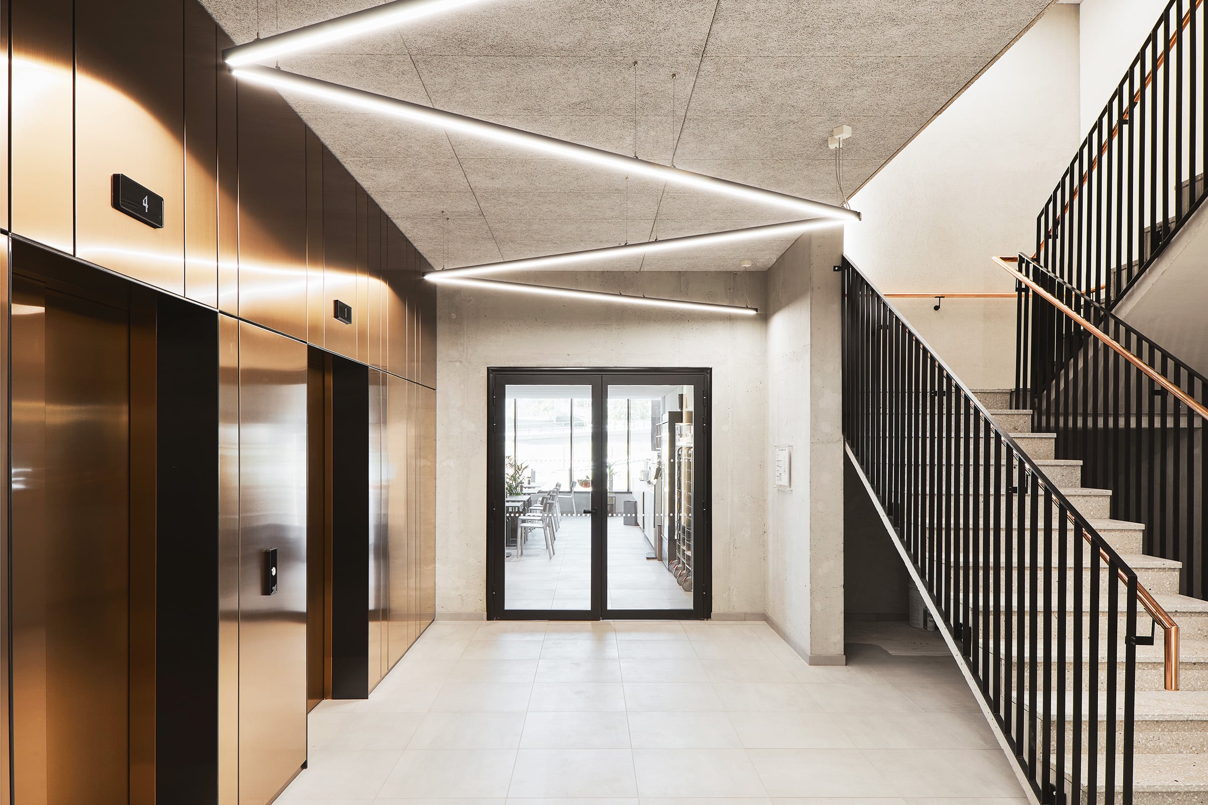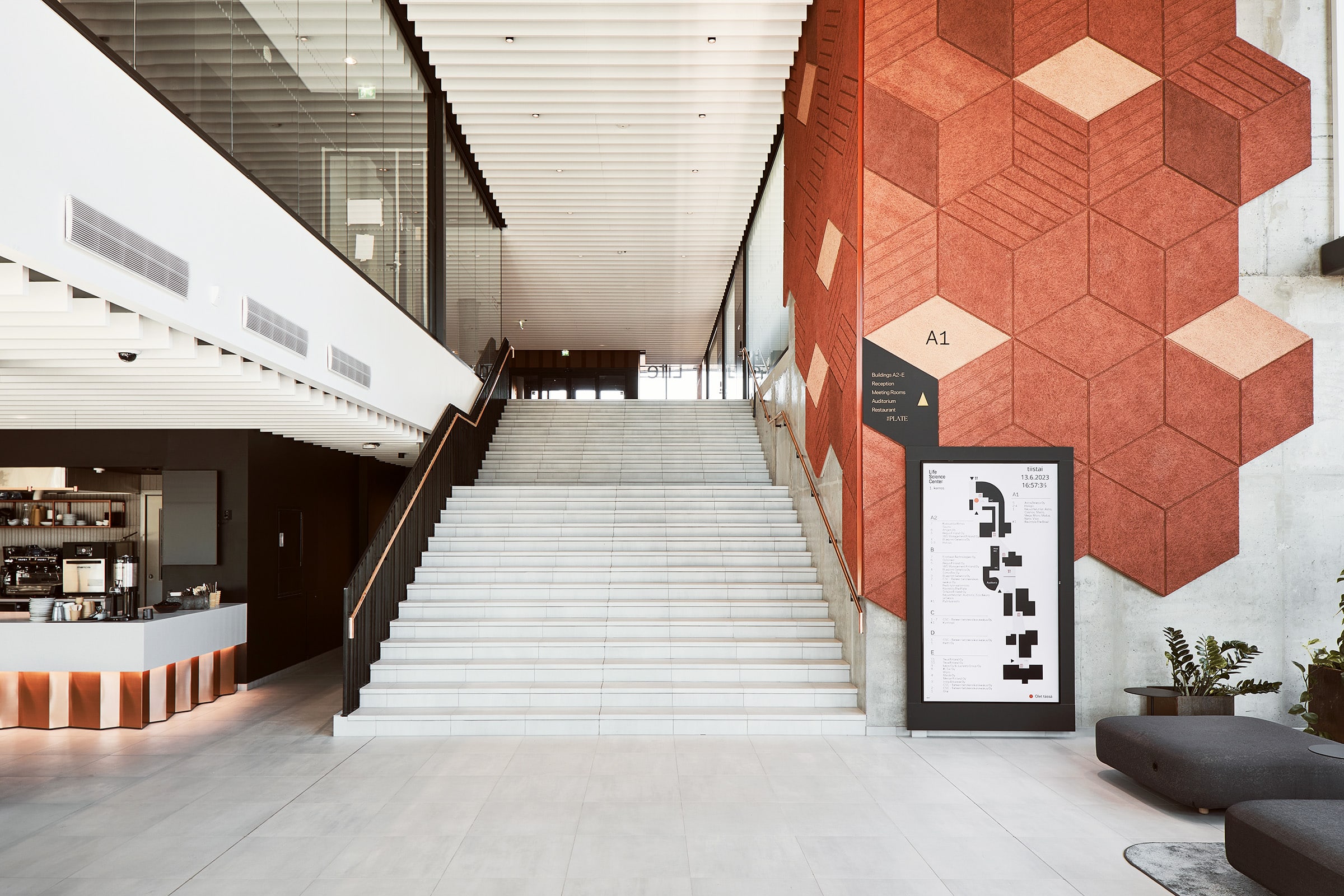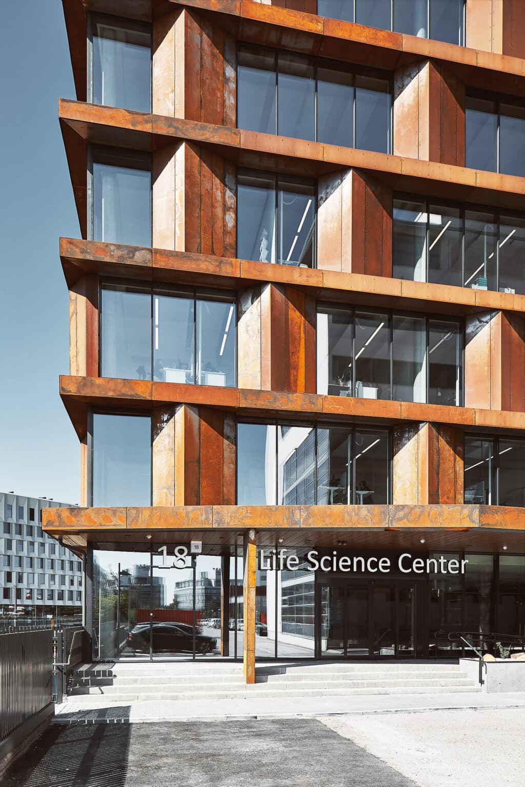1. kerroksen aulatila jatkuu korkeana tilana 2. kerrokseen missä sijaitsevat vastaanotto, neuvottelutiloja, toimistotilaa sekä sisäyhteys LSC:n olemassa oleviin toimistorakennuksiin ja ulkoyhteys pysäköintikannelle. Rakennuksen 3.-7. kerrokset ovat toimistokerroksia.