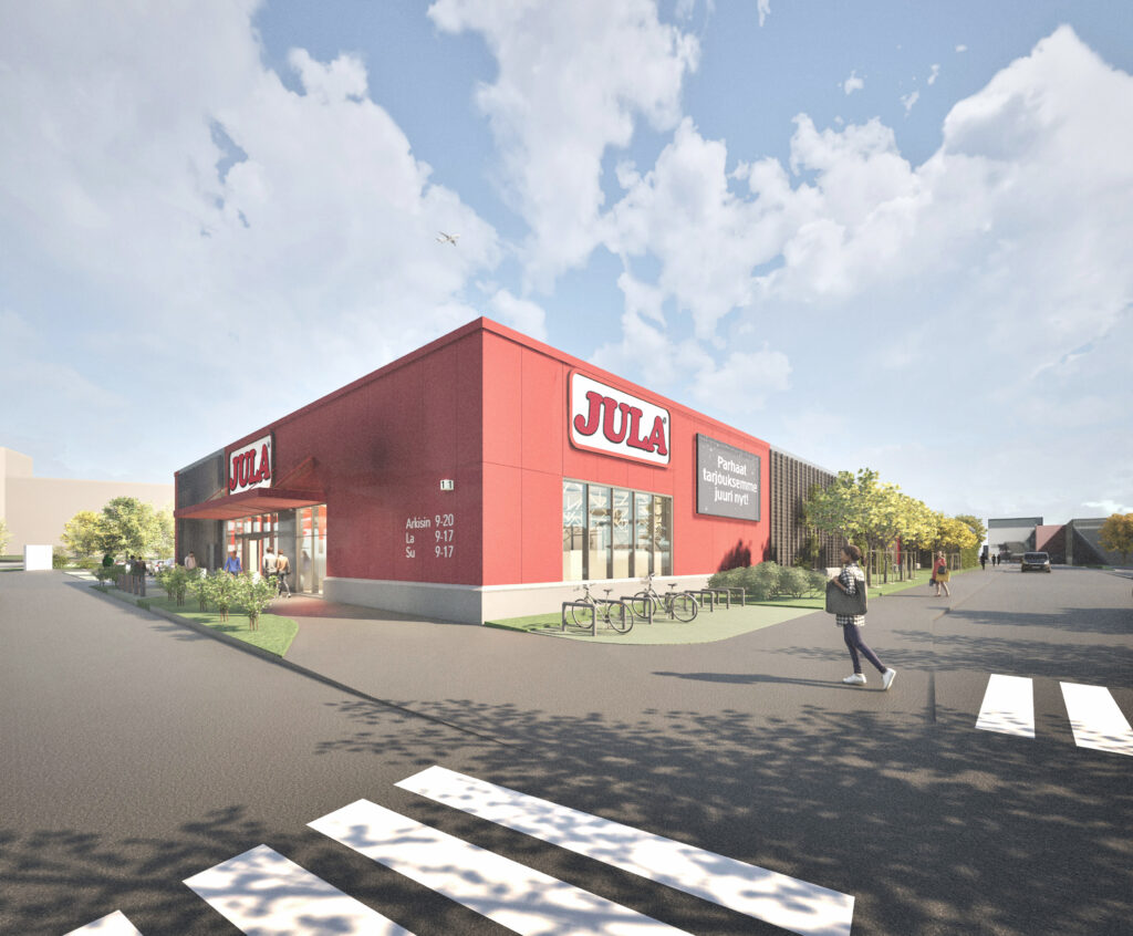 Rakennus on pääosin yksikerroksinen, noin 2700 brm²:n liikerakennus, jossa myymälätila muodostaa suurimman osan tiloista ja varasto-, lastaus- sekä aputilat sijaitsevat pohjoispäädyssä. Julkisivut on toteutettu pääosin keskiharmaista metallipintaisista kevytelementeistä, ja Ristipellontien sekä Ristipellonkujan puoleisissa julkisivuissa on pystyprofiileilla tehdyt korostukset.