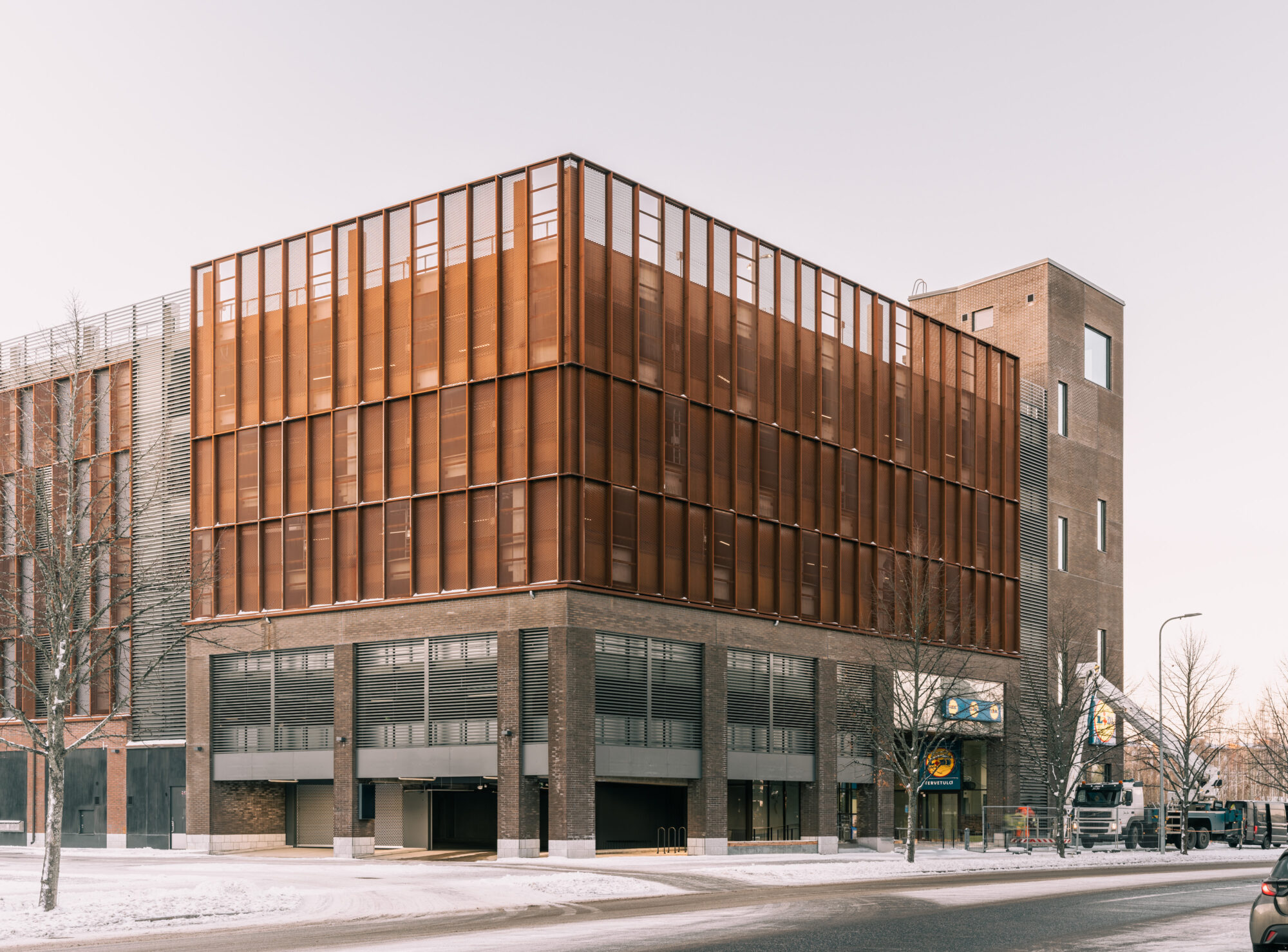 Noin 1400 m²:n laajuinen, valoisa myymälä avautuu katutasoon tiilen ja lasin rytmittämänä. Maantason materiaalit ja mittakaava kytkevät liiketilan osaksi toimistorakennuksen arkkitehtonista kokonaisuutta, pysäköintitalon ensimmäinen kerros ja porrashuoneet jatkavat toimistorakennuksen tiiliverhoiltua ilmettä, jolloin kortteli hahmottuu yhtenäisenä.