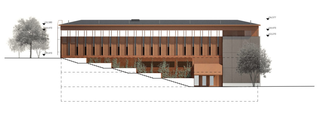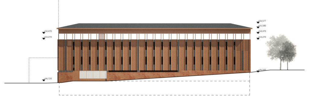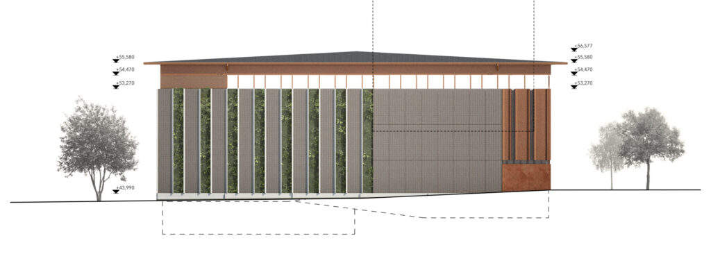 Vesikatto toteutetaan kevyenä, horisontaalisesti hahmottuvana aumakattona. Katon ja julkisivun väliin jäävä valoaukko tuo rakennukseen avaruutta ja luonnonvaloa.