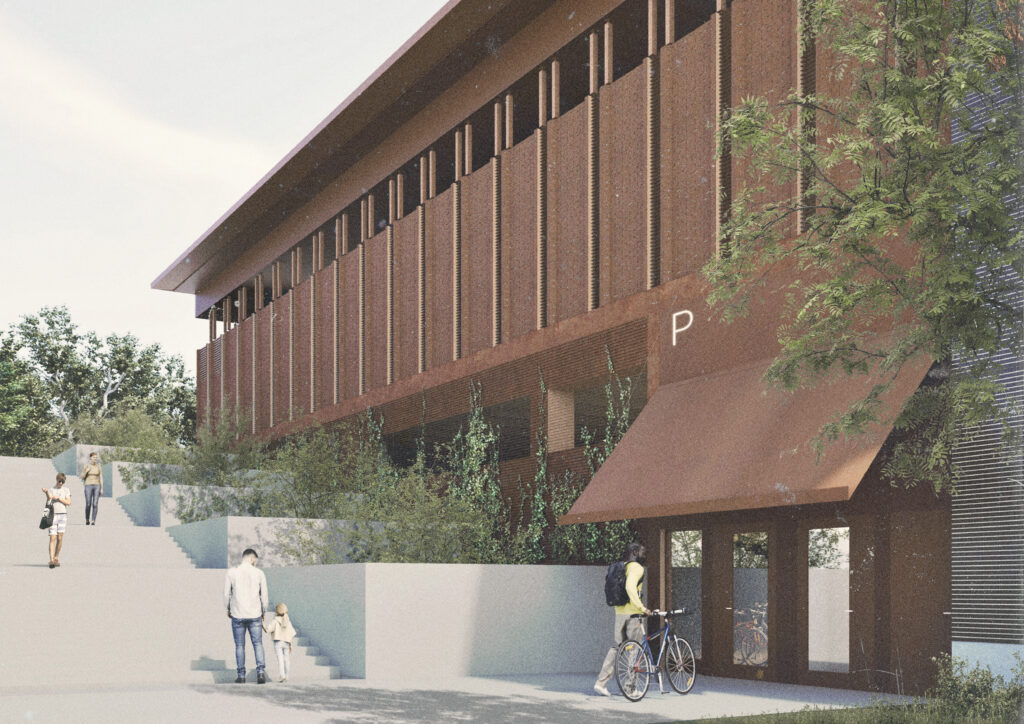 Rakennuksen arkkitehtuuri perustuu alkuperäiseen suunnitelmaan, jossa umpielementit ja vertikaaliset aukot muodostavat selkeän rytmin. Aukoissa olemassa olevat vaakasäleet estävät ajovalojen häikäisyn. Uudelleenkäytettävät klinkkeripintaiset elementit tuovat julkisivuihin kerroksellisuutta ja ekologista arvoa. Niihin kiinnitettävät korkeina kohoavat viherseinät korostavat pysäköintitalon pystysuuntaista arkkitehtuuria ja tuovat vehreyttä kaupunkikuvaan. Länsisivulle suunnitellut viheristutukset täydentävät kokonaisuutta.