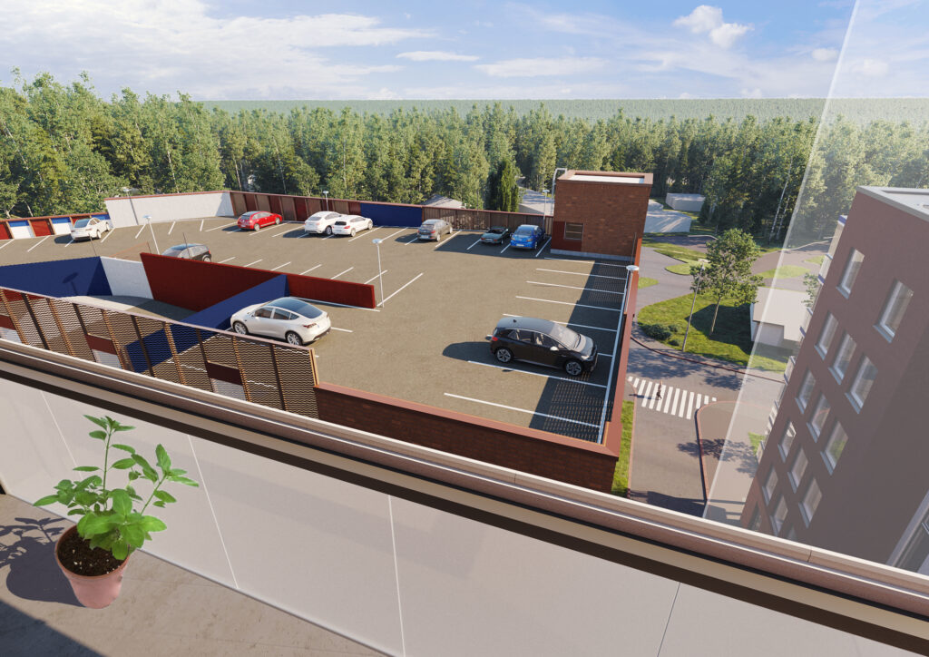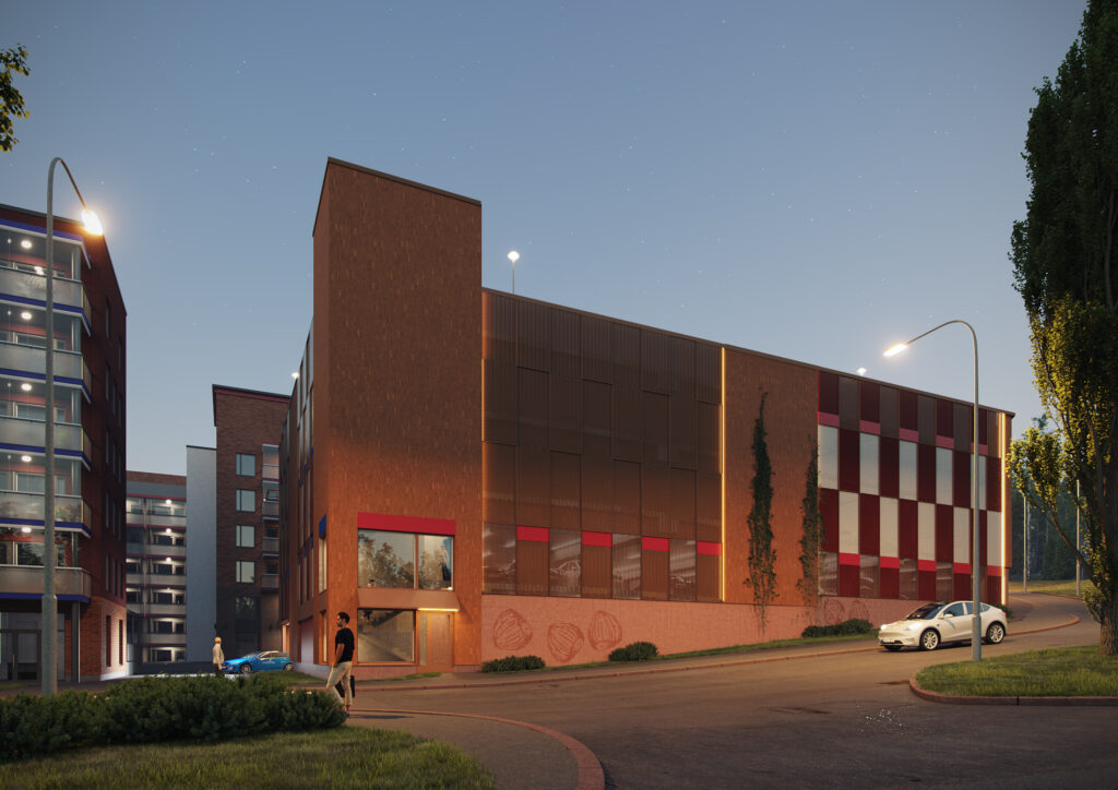 Asemakaavan tavoitteiden mukaisesti rakennus muodostaa korkeatasoista ja kaupunkimaista katukuvaa alueen kulttuurihistoriallisesti arvokkaille 60-luvun lamellitaloille ominaisin elein. Se kunnioittaa alueen punatiilivaltaista värimaailmaa, ja toistaa vanhojen lamellitalojen voimakasta värien käyttöä, rytmitystä ja jäsentelyä modernein keinoin. Massaa on pilkottu pienempiin, asuintalomaisiin viipaleisiin, välttäen mittakaavakontrastia, joka hyvin herkästi asuinrakennusten ja pysäköintilaitosten välille syntyy.