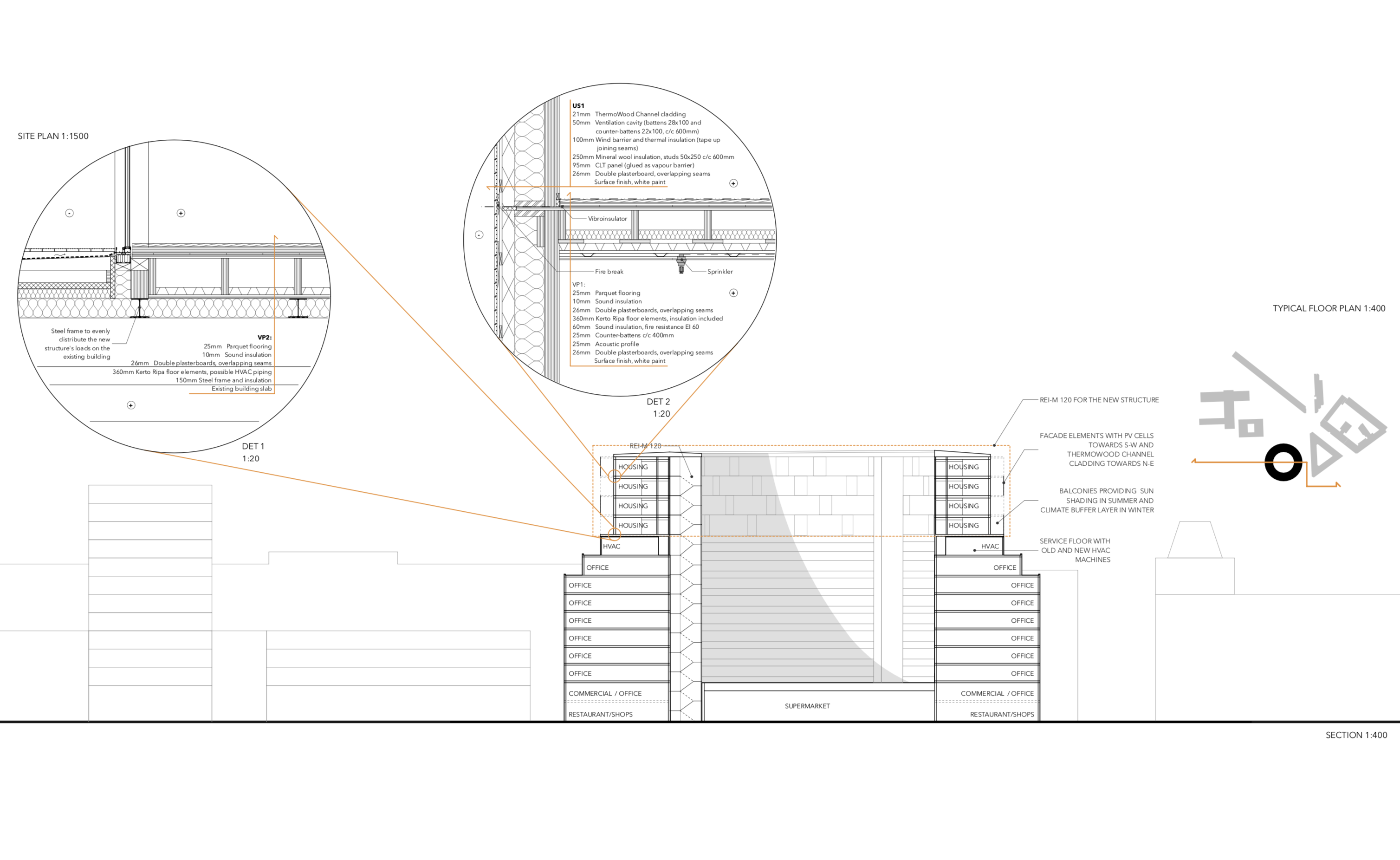 Neljä uutta kerrosta lisätään nykyisen rakennusmassan päälle. Nykyinen ylin kerros on palvelukerros, ja se sisältäisi jatkossa sekä vanhat että uudet LVI-järjestelmät puskurointikerroksena uusien ja vanhojen rakenteiden välillä.