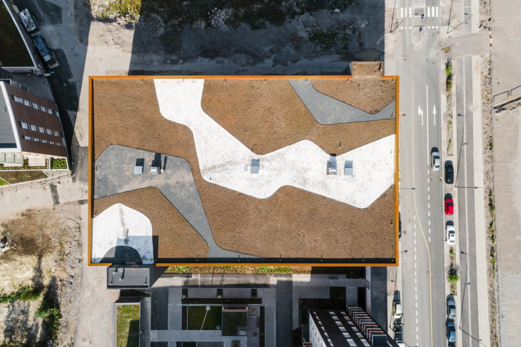 Oman viidennen julkisivunsa rakennukselle muodostaa suuri viherkatto, jonka muotoaiheista Berry Creative myös vastasi.