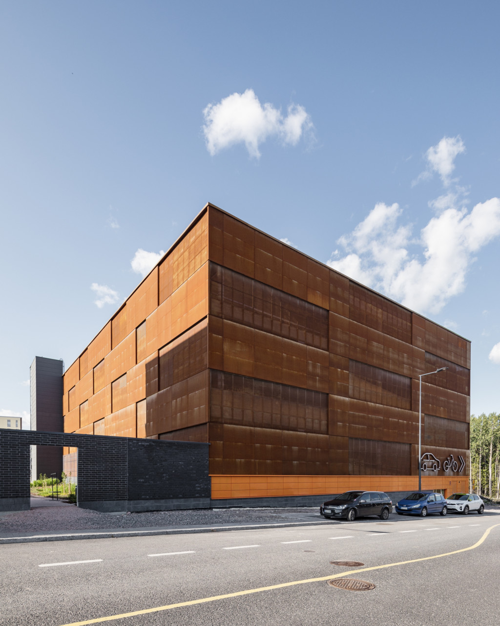 Rakennuksessa on yhteensä 386 autopaikkaa. Paikoituslaitoksesta haluttiin alueelle myös selkeä positiivinen maamerkki. Valtaosin tiiliarkkitehtuurista koostuvalle alueelle valittiin materiaaliksi corten ja julkisivuissa corten-levyistä rakennettiin ”megatiiliä”. Suuri rakennus ottaa mittakaavallisesti hyvin paikkansa tiukassa kaupunkitilassa. Kevyen liikenteen risteyskohtaan sijoittuu koko korttelia palveleva polkupyörien huoltotila.