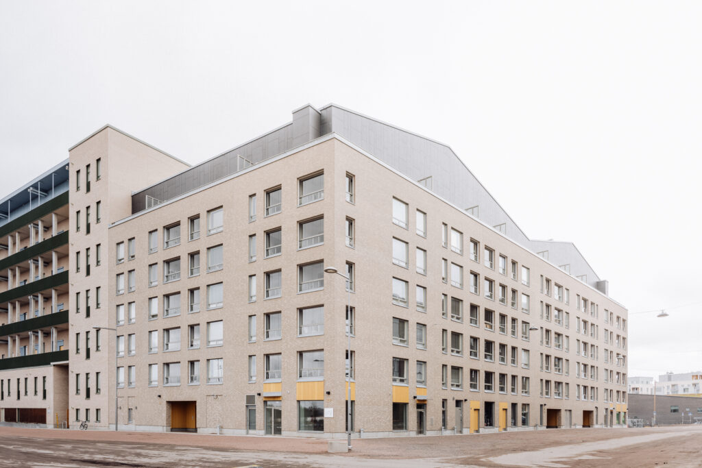 Kadun puoleiset julkisivut muodostuvat pehmeän harmaan sävyisestä puhtaaksi muuratusta tiilipinnasta sekä lasitetuista parvekkeista. Sisäänkäyntisyvennykset ovat puuverhoiltuja, kuten myös liiketilan ikkunoiden ja yläpuolella olevien parvekkeiden välinen osa. Rakennuksien 7. kerros on katujen puolella sisäänvedetty asemakaavan mukaisesti. Sisäänvedon myötä ylimmän kerroksen asunnoilla ja yhteistiloilla on käytössään omat terassit.
