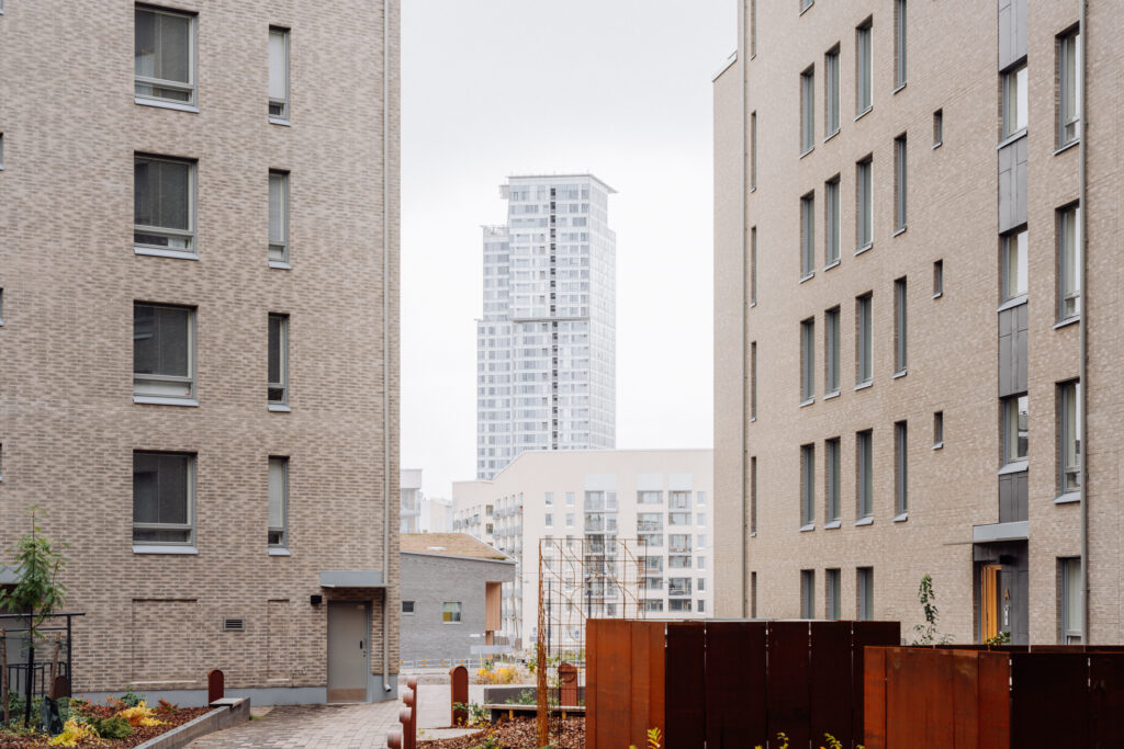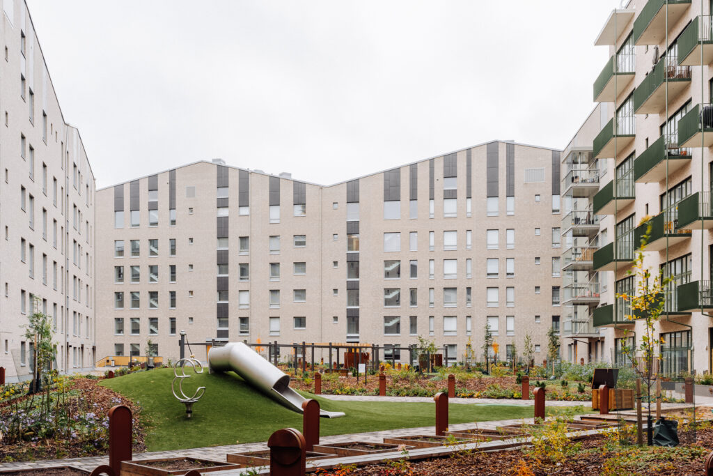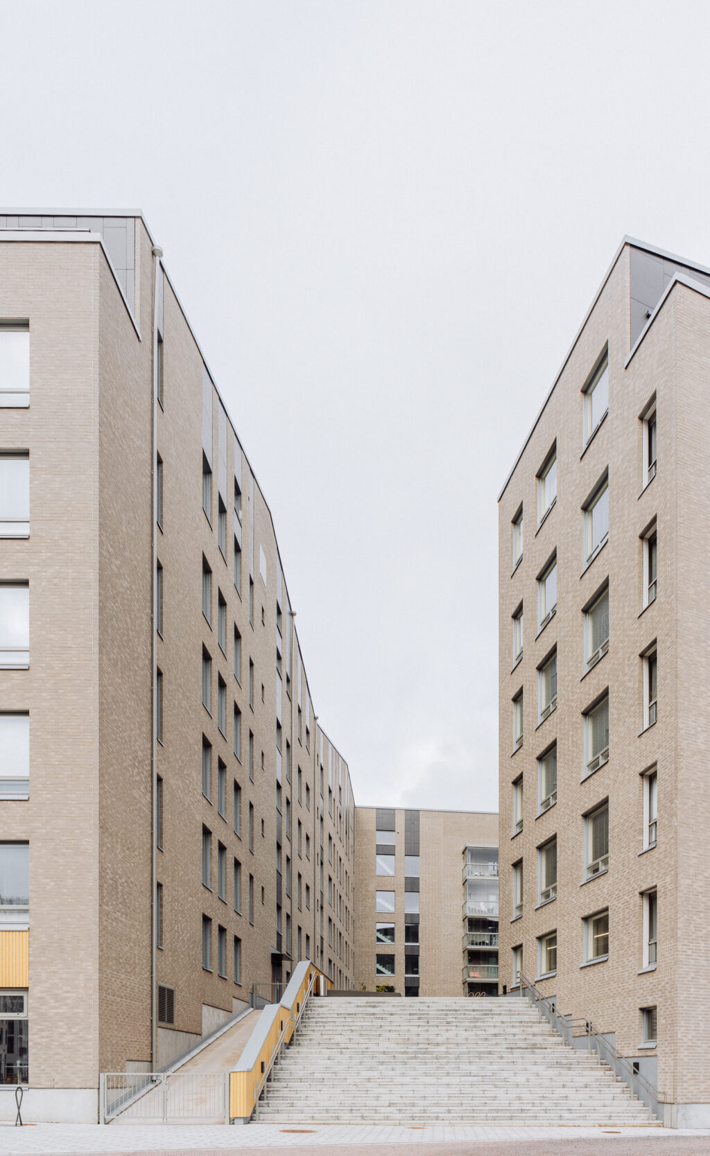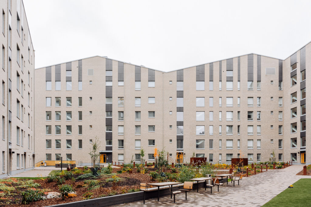 Sisäpihan julkisivut ovat toteutettu pääosin samalla puhtaaksi muuratulla tiilellä kuin kadunpuoleiset julkisivut. Sisäpihan julkisivun aukotukseen liittyy pystysuuntaiset julkisivulevypinnat, jotka korostavat rakennuksien kattomuotoa sekä sisäänkäyntejä. Rakennuksien kattomuoto on vapaamuotoinen harjakatto. Vesikatto on toteutettu viherkattona. Vesikatoille on asennettu myös aurinkopaneeleja.