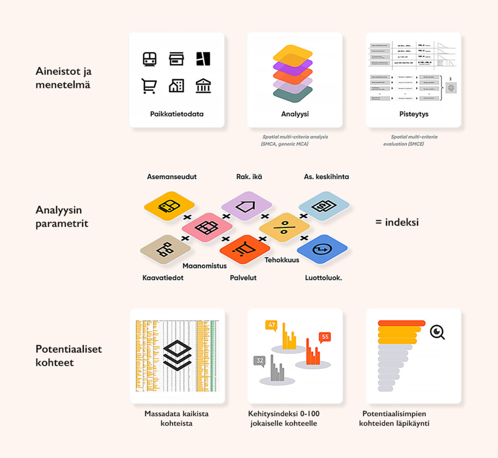 Analyysi alkaa kaavavarannon kartoituksella, jossa selvitetään voimassa olevien kaavojen tarjoamat mahdollisuudet eri käyttötarkoituksille. Tämän jälkeen analyysi etenee soveltuvien kaavojen ja sijaintien arviointiin esimerkiksi palveluiden ja saavutettavuuden perusteella. Lopuksi yksittäisiä sijainteja tarkastellaan mikrotasolla asiantuntijoiden tuella.