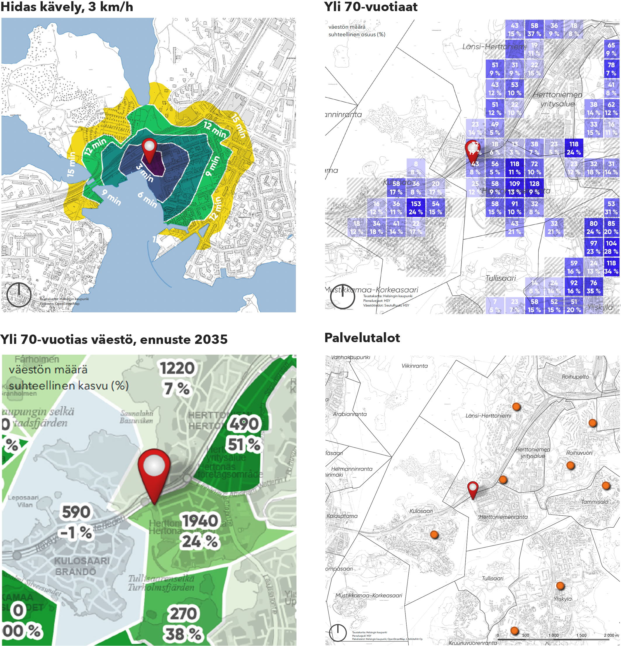 Herttoniemen tapauksessa analysoitiin saavutettavuutta (työntekijät) sekä mm. alueen ikäjakaumaa, tulotasoa ja väestön ikääntymisennustetta.